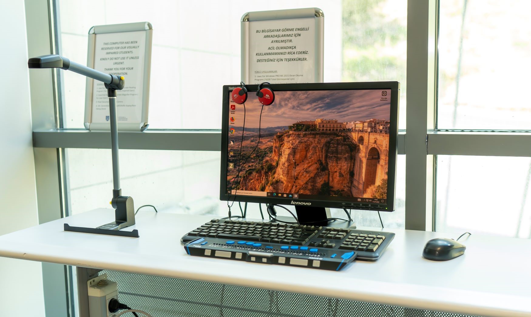 Görme engelli ya da az gören kullanıcılarımıza yönelik tasarlanmış çalışma istasyonu ve lisansüstü öğrencilerimiz için hazırlanan araştırma odamız her zaman kullanıma açıktır.