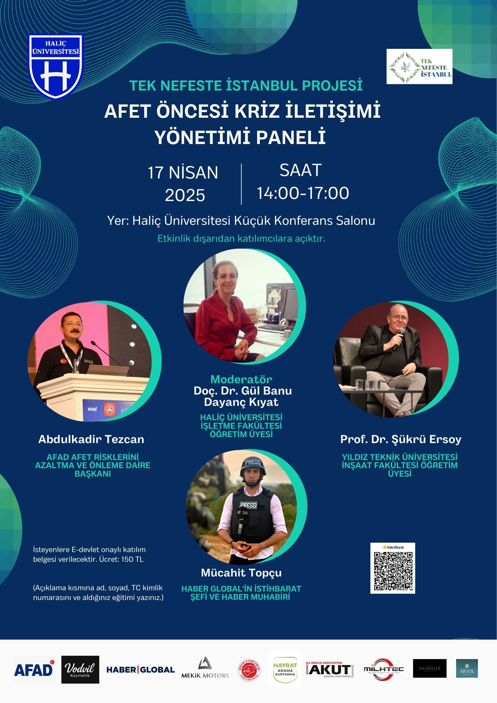 Haliç Üniversitesi olarak bu yılki "Tek Nefeste İstanbul" Kurumsal Sosyal Sorumluluk projemiz kapsamında, toplumsal bilinç ve afet farkındalığını artırmayı amaçlayan çok değerli bir panelle sizlerle buluşuyoruz.