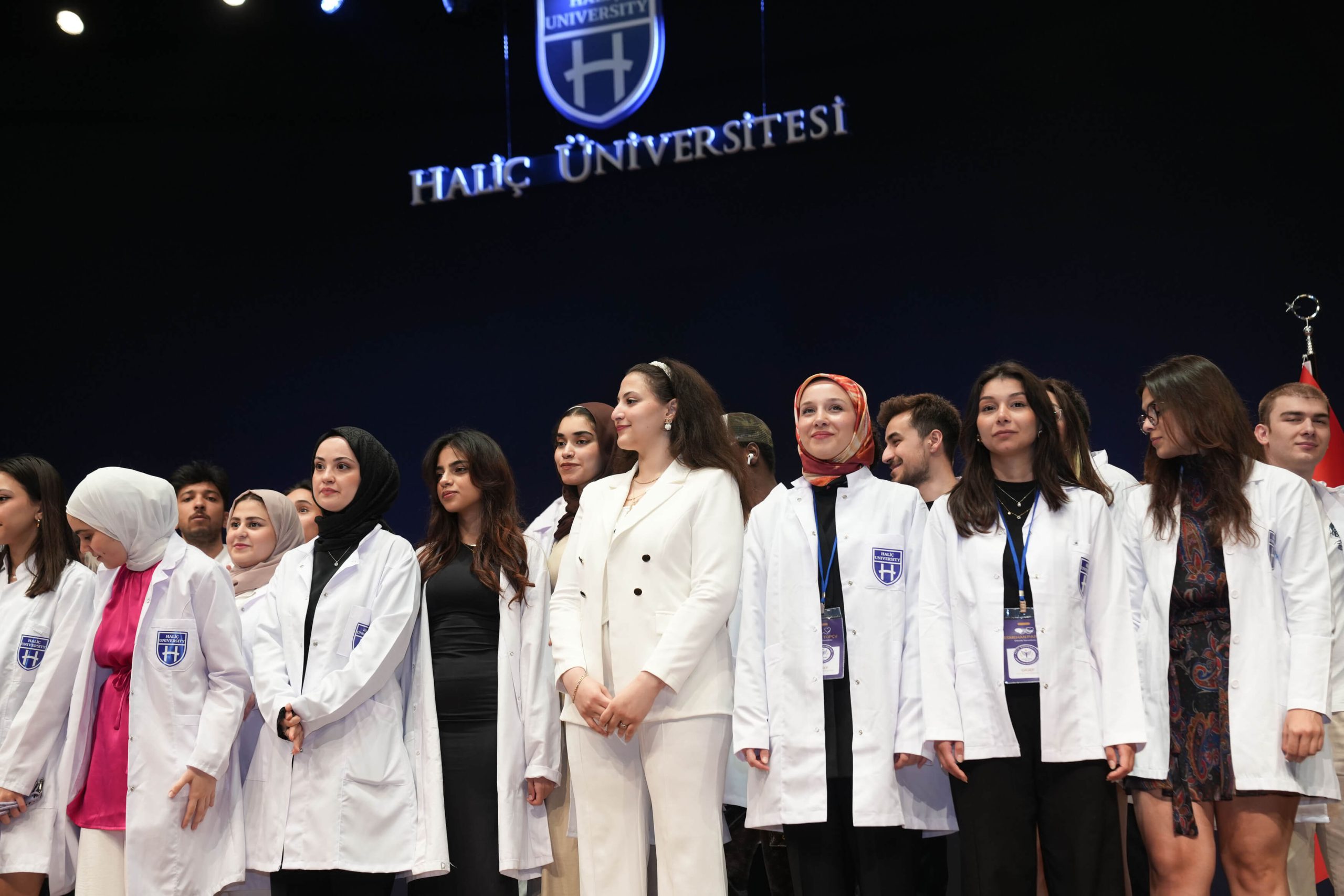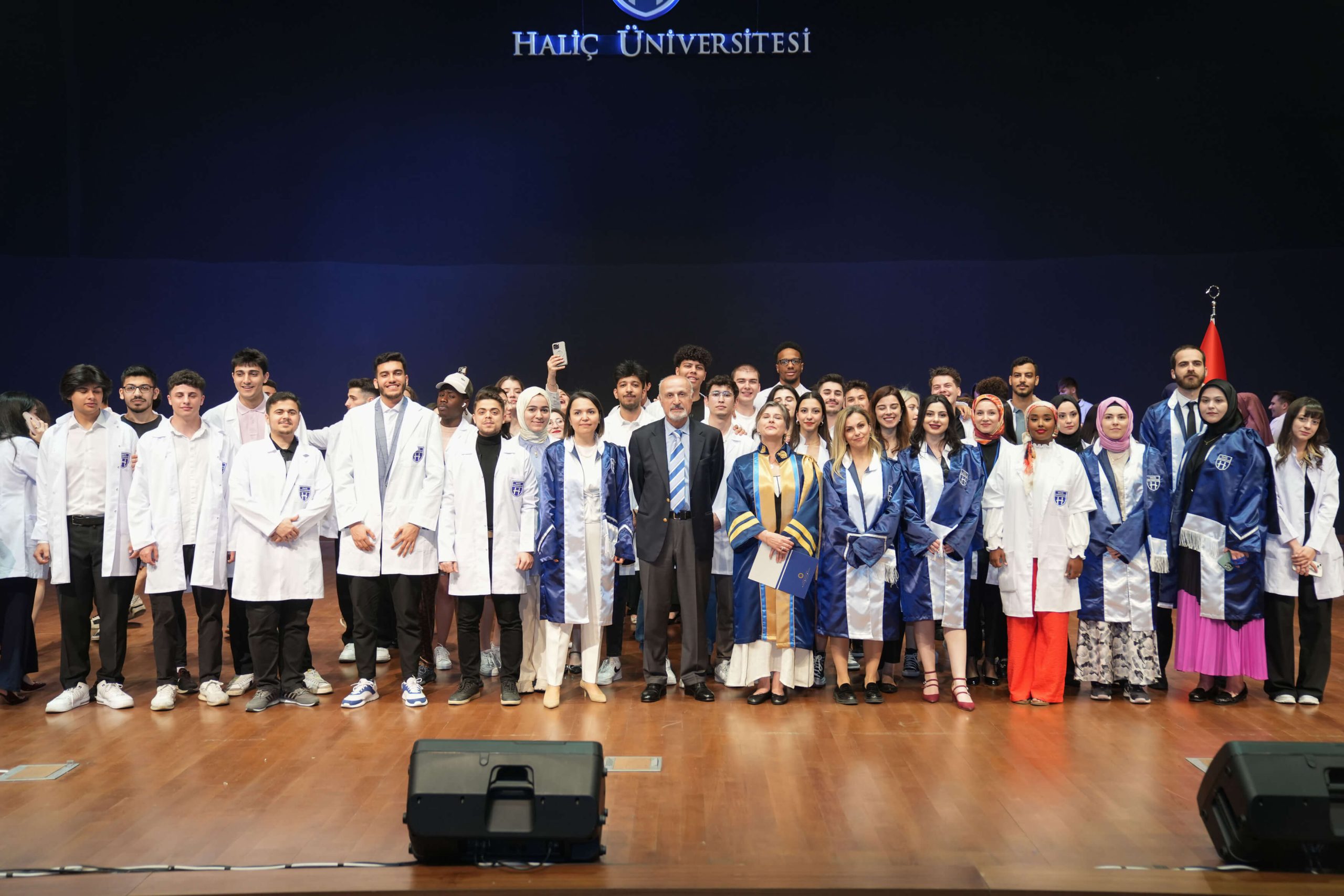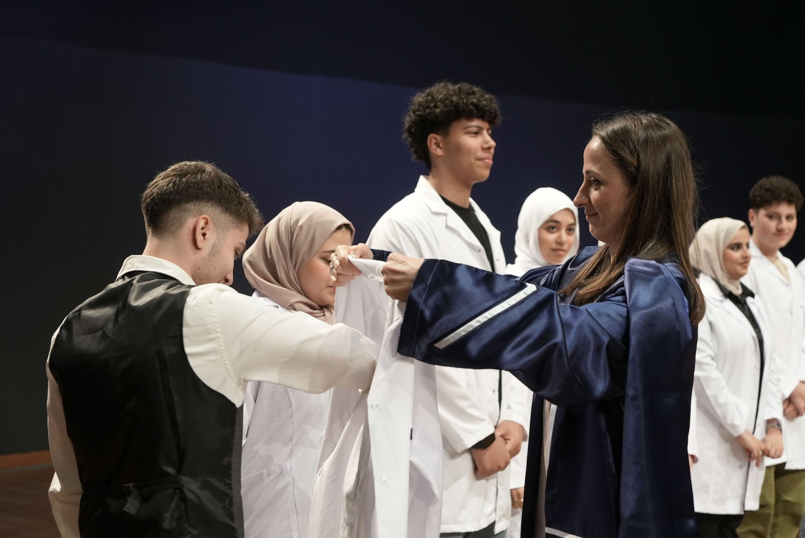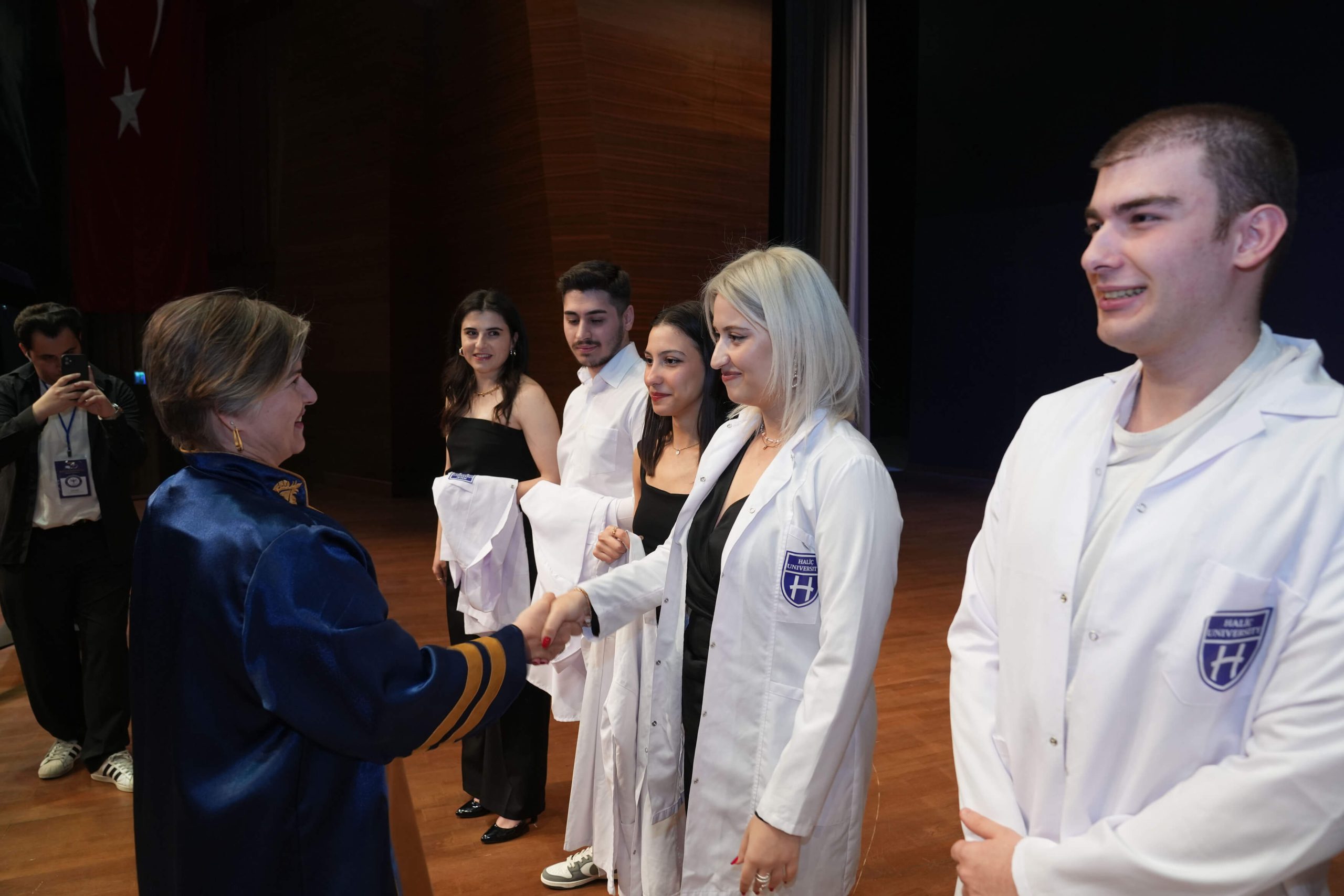 Fizyoterapi ve Rehabilitasyon Bölümü Beyaz Önlük Giyme Töreni, Küçük Konferans Salonunda akademisyenlerimiz, öğrencilerimiz ve ailelerinin katılımlarıyla gerçekleşti. Türkçe ve İngilizce olarak iki dilde düzenlenen tören, saygı duruşu ve İstiklal Marşı ile başladı. Tören, Sağlık Bilimleri Fakültesi Dekan Yardımcısı ve Fizyoterapi ve Rehabilitasyon (Türkçe) Bölüm Başkanı Seda Saka ile Fizyoterapi ve Rehabilitasyon (İngilizce) Bölüm Başkanı Seda Yıldız’ın konuşmalarıyla devam etti. Hocalarımız, fizyoterapist olmanın öneminden ve gerekliliğinden bahsederek; beyaz önlük giyilmesinin öğrencilerin sağlık çalışanı olmalarının onurlandırdığı bir tören olduğuna değindi.