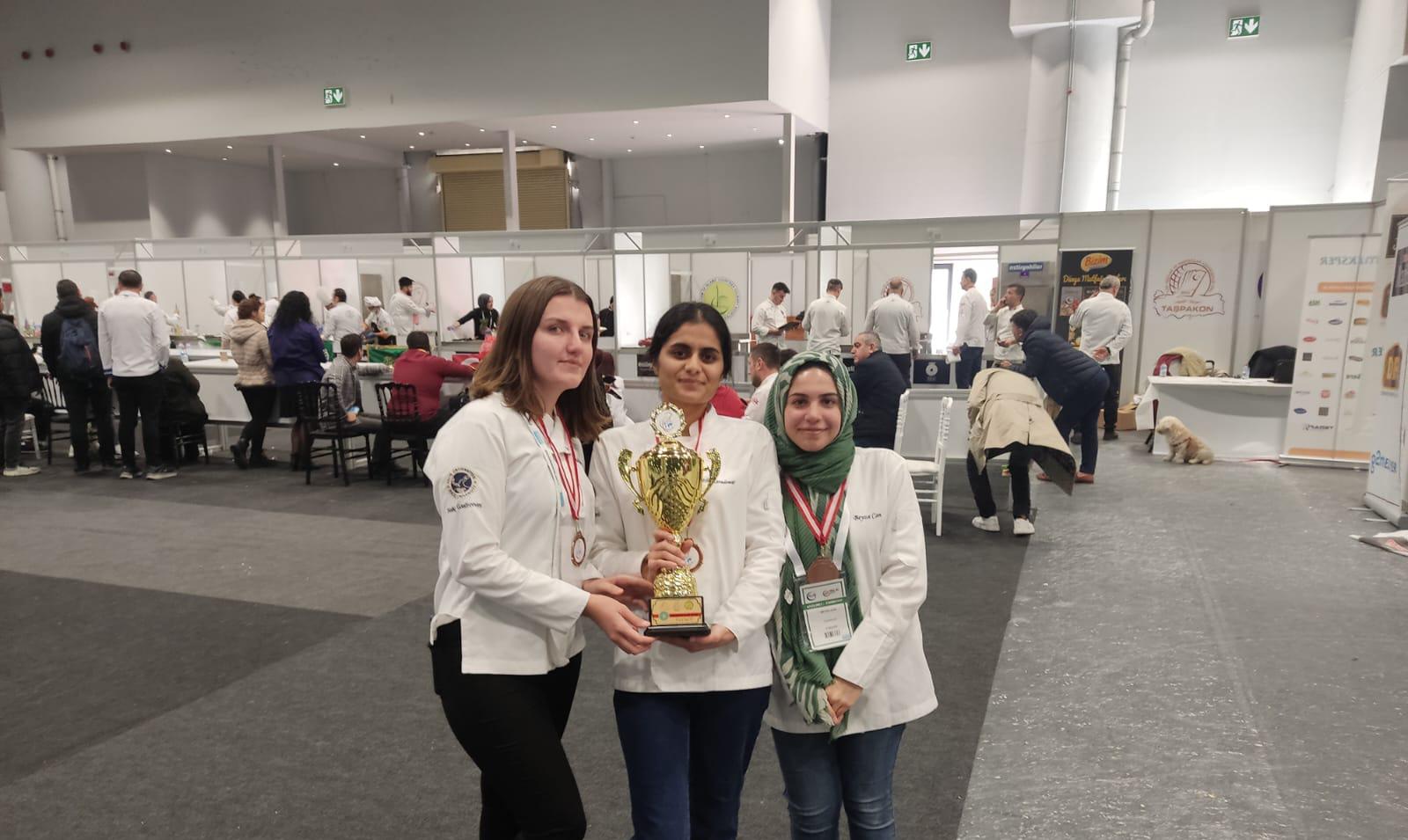 Güzel Sanatlar Fakültesi Gastronomi ve Mutfak Sanatları Bölümü 3. sınıf öğrencilerimiz Beyza CAN, Damla AYDIN ve Elif KARADEMİR Tüm Aşçılar ve Pastacılar Konfederasyonu tarafından düzenlenen Dünya Aşçılar Şampiyonası – World Cooks Championship yarışmasında Yılın En İyi Üniversitesi kategorisinde 3. lük elde ederek büyük bir başarıya imza atmış ve kupa ödülü almaya hak kazanmıştır.