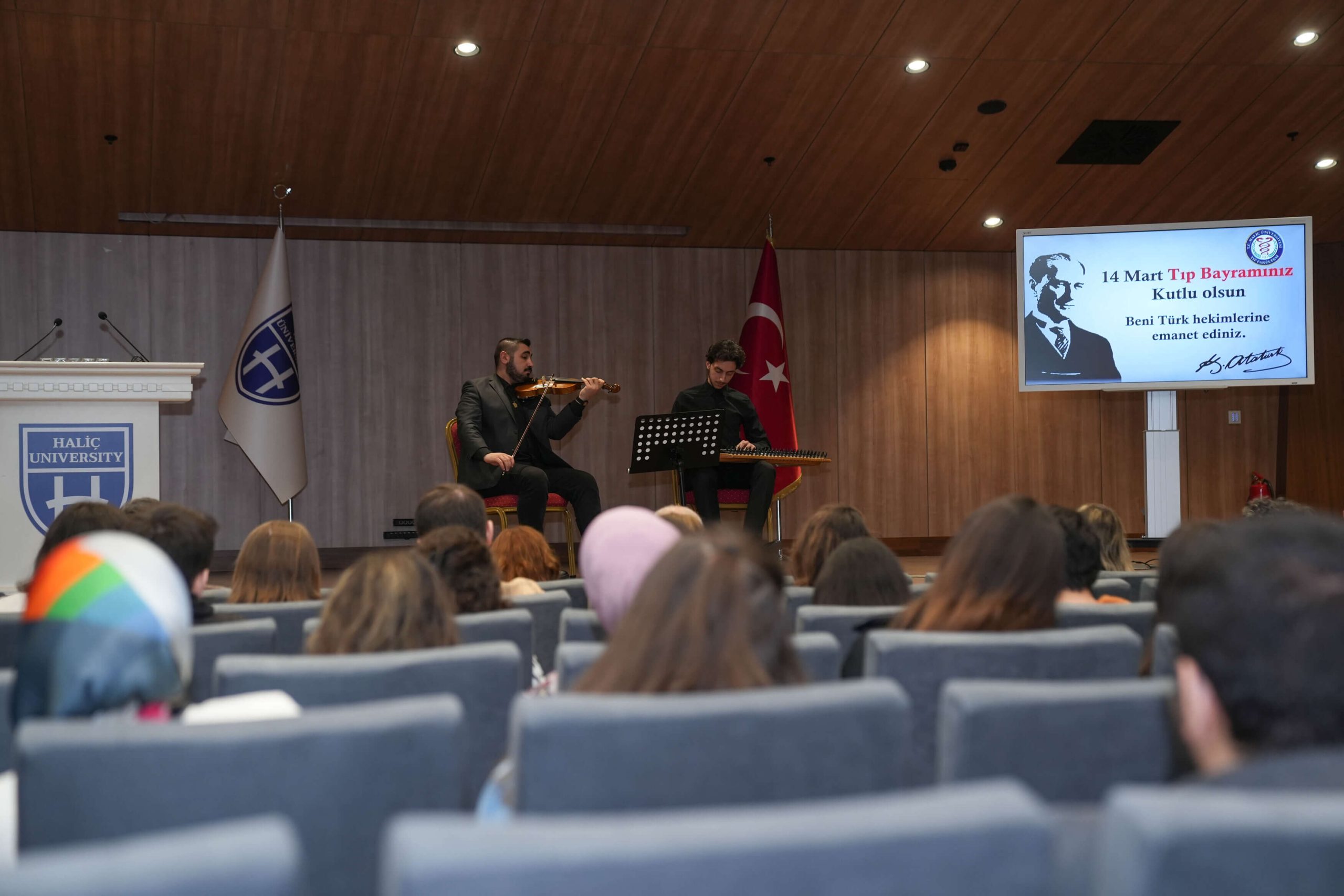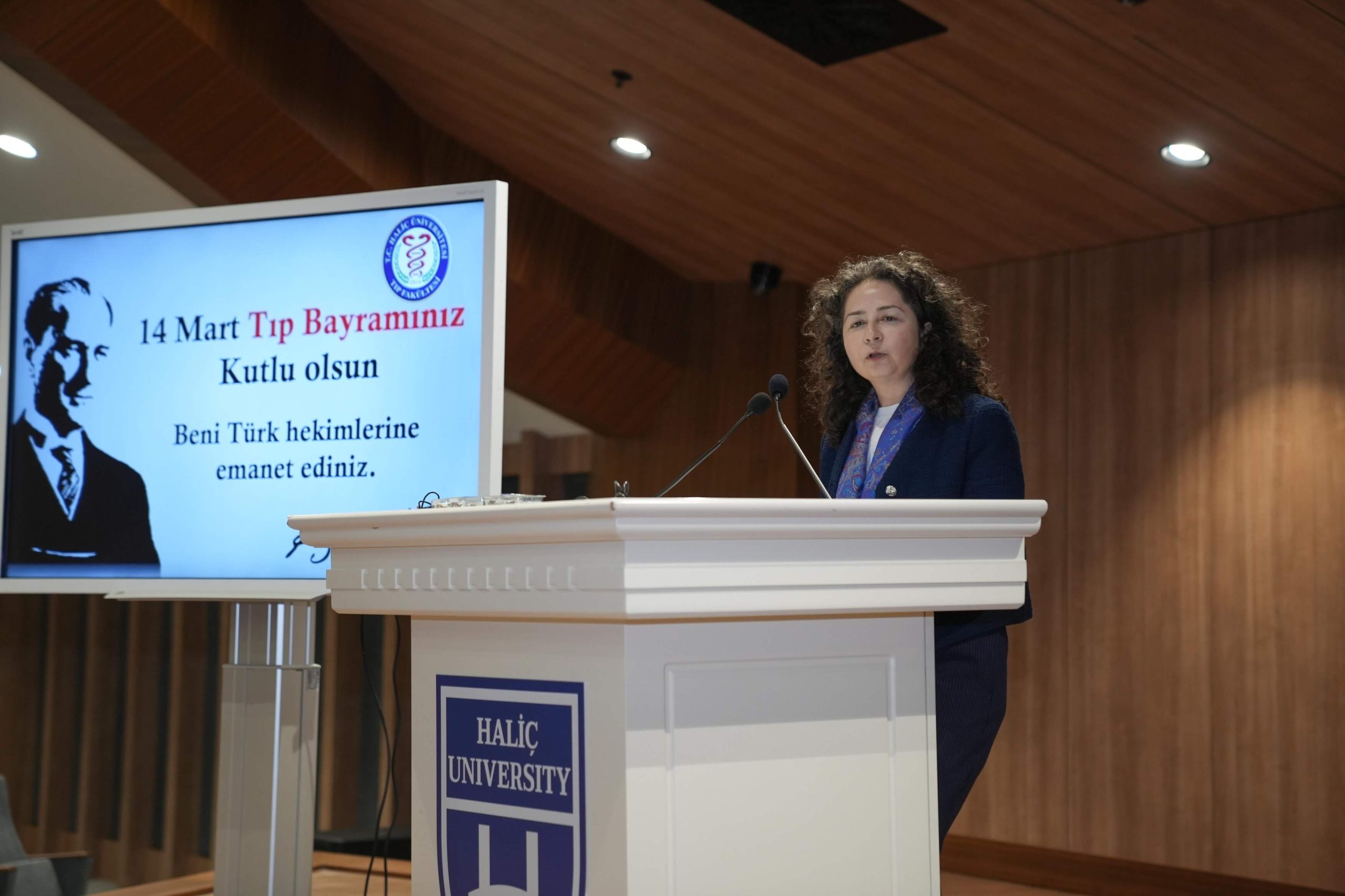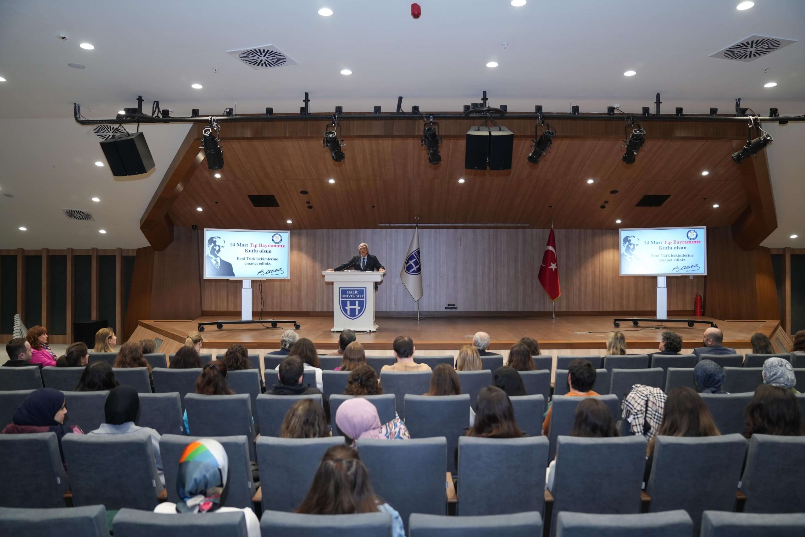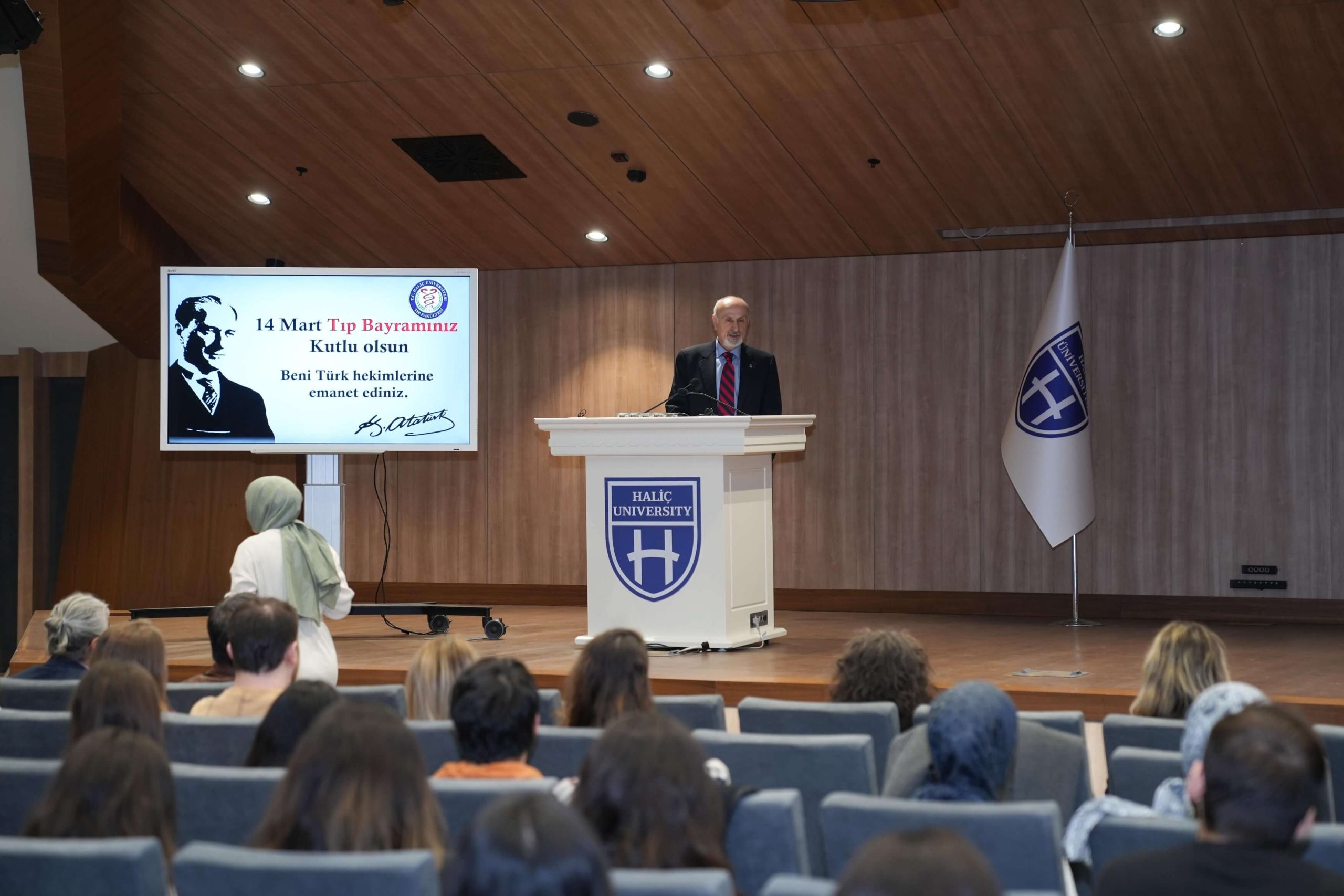Haliç Üniversitesi Tıp Fakültesi’nin düzenlediği 14 Mart Tıp Bayramı etkinliği, dekanlar ve bölüm başkanlarının katılımıyla gerçekleşti. Program, saygı duruşu ve İstiklal Marşı’nın okunmasıyla başladı. Ardından günün anlam ve önemini anlatmak için konuşmalar yapıldı.