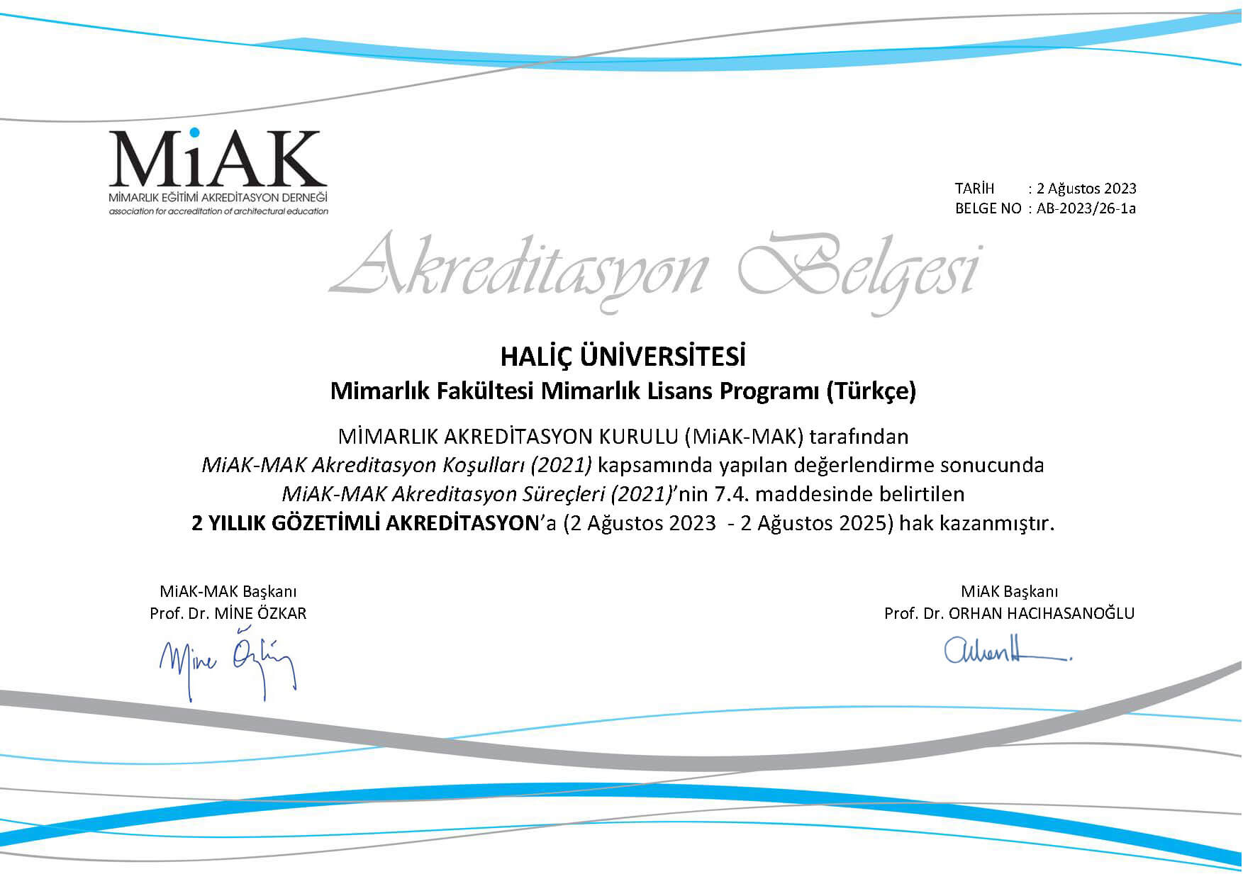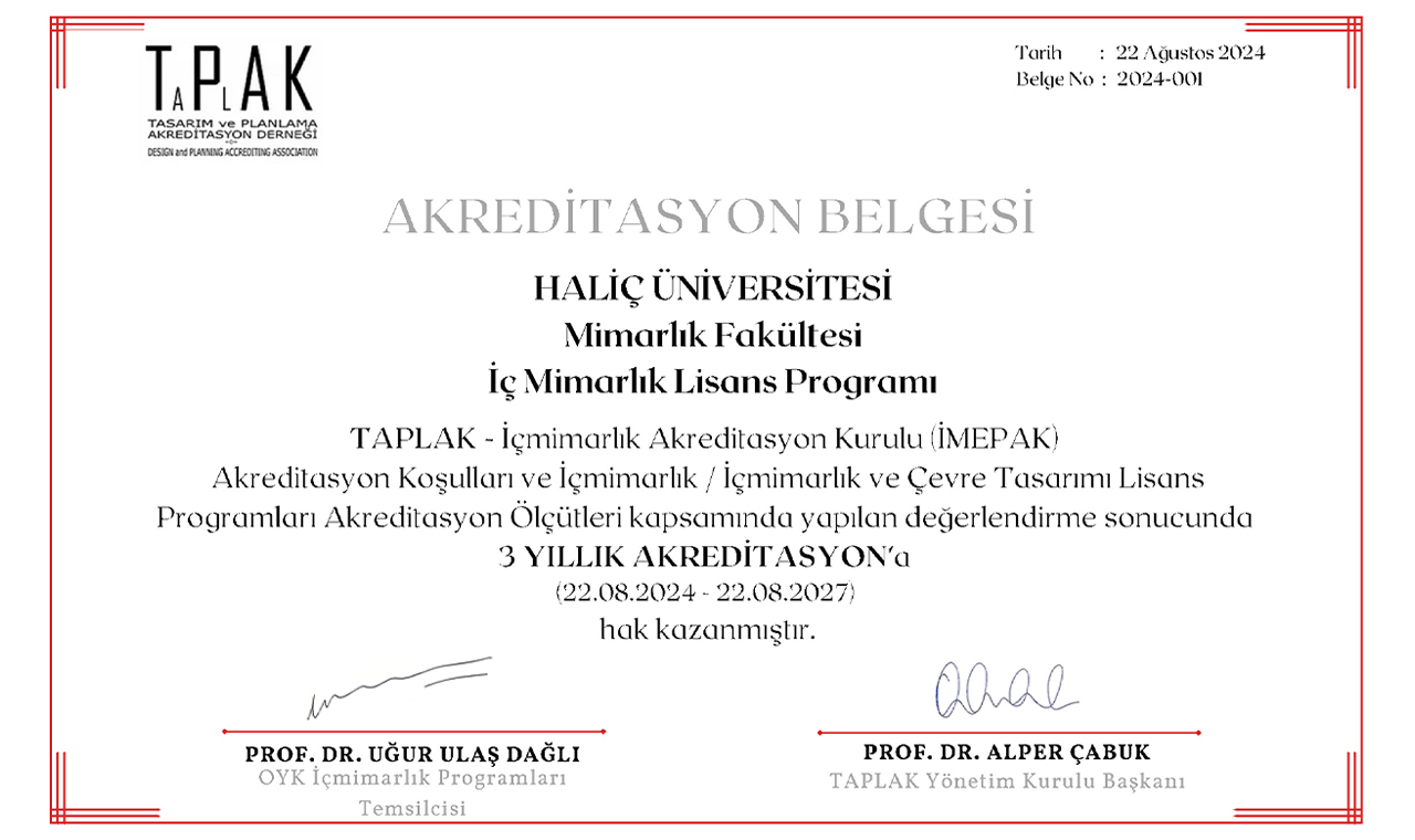 Haliç Üniversitesi Mimarlık Fakültesi, İç Mimarlık ve Çevre Tasarımı Bölümü, TAPLAK-İç Mimarlık Akreditasyon Kurulu (İMEPAK) akreditasyon koşulları ve İç Mimarlık/İç Mimarlık ve Çevre Tasarımı lisans programları akreditasyon ölçütleri kapsamında yapılan değerlendirme sonucunda 3 yıllık süreyle akredite edilmiştir. Fakültenin daha önce akredite olan Mimarlık ve Endüstriyel Tasarım bölümlerine ek olarak, İç Mimarlık ve Çevre Tasarımı Bölümü de akredite edilerek, Mimarlık Fakültesi’nin tüm bölümleri akreditasyon sürecini başarıyla tamamlamıştır. Bu, Haliç Üniversitesi için önemli bir adım olup, başta Mimarlık Fakültesi Dekanı Prof. Dr. Sayın Füsun Seçer Kariptaş olmak üzere, Endüstriyel Tasarım Eğitiminin Türkiye’deki Kurucusu ve Duayen Hocamız Haliç Üniversitesi Endüstriyel Tasarım Bölümü Öğretim Üyesi Prof. Dr. Sayın Önder Küçükerman’a, Endüstriyel Tasarım Bölüm Başkanı Dr. Öğr. Üyesi Zeynep Fırat Ezenci’ye, Mimarlık Bölüm Başkanı Doç. Dr. Gözde Çakır Kıasıf’a ve İç Mimarlık ve Çevre Tasarımı Bölüm Başkanı Doç. Dr. Fatma Ceyda Güney Yüksel’e teşekkür ederiz. Ayrıca, bu süreçte emeği geçen tüm akademik ve idari personelimize katkılarından dolayı teşekkür ederiz.