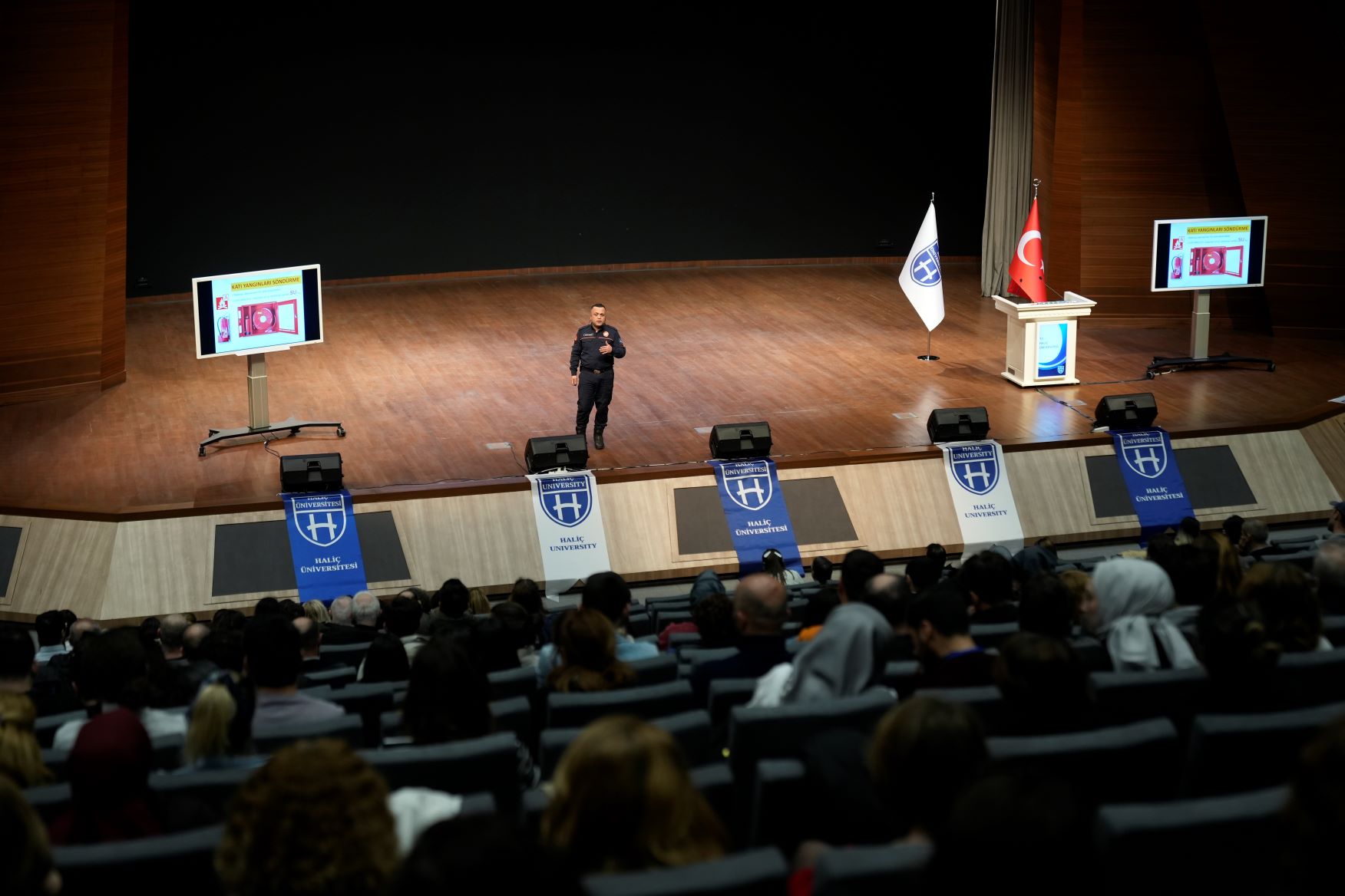 Büyük konferans salonunda gerçekleşen programda İBB İstanbul Avrupa Yakası İtfaiyesi yetkilisi Oktay Peker yangın güvenliği konusunda bir eğitim sunumu yaptı. Eğitimde yangına karşı bilinçli olmak, doğru müdahale yöntemlerini öğrenmek ve güvenli tahliye prosedürleri gibi konulara dikkat çekildi.