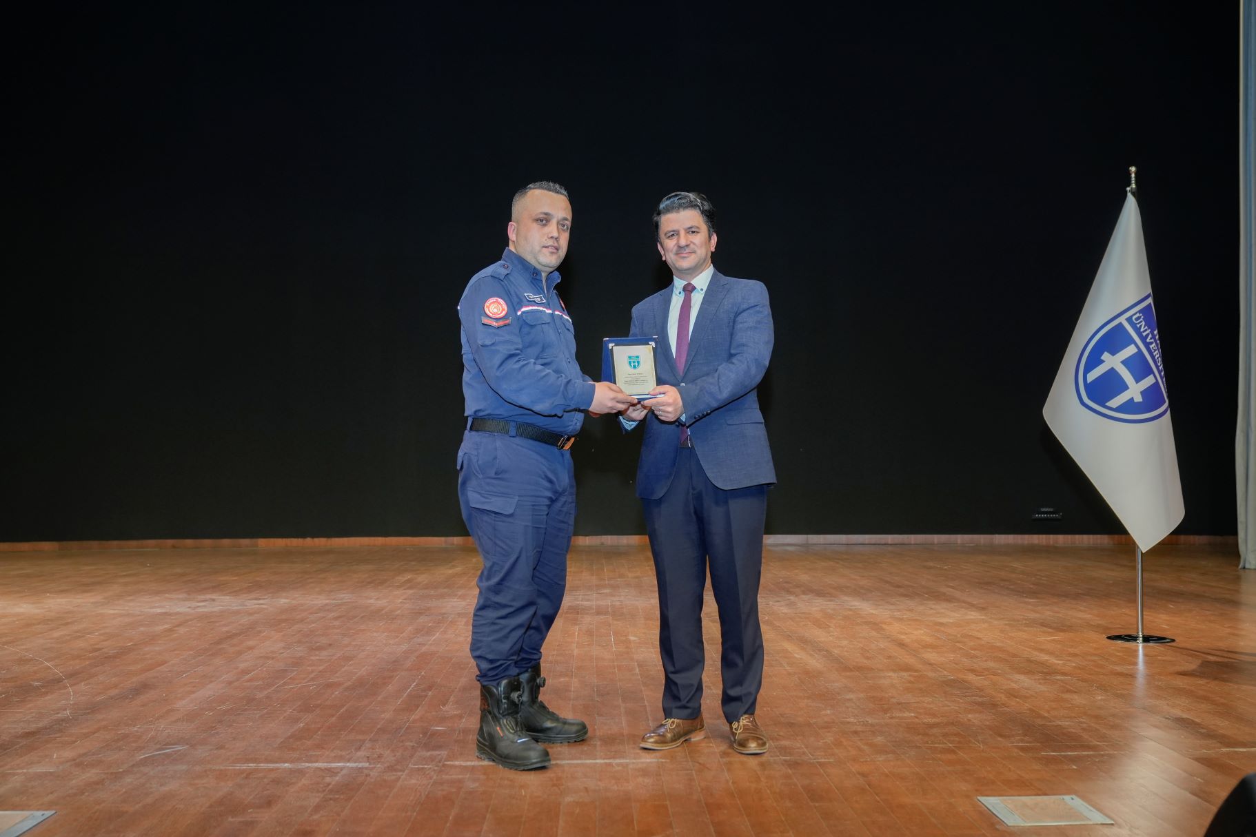 Etkinlik sonunda, katkılarından dolayı İstanbul İtfaiyesi yetkilisi Oktay Peker’e Haliç Üniversitesi Genel Sekreteri Alim Uçar tarafından plaket takdim edildi.