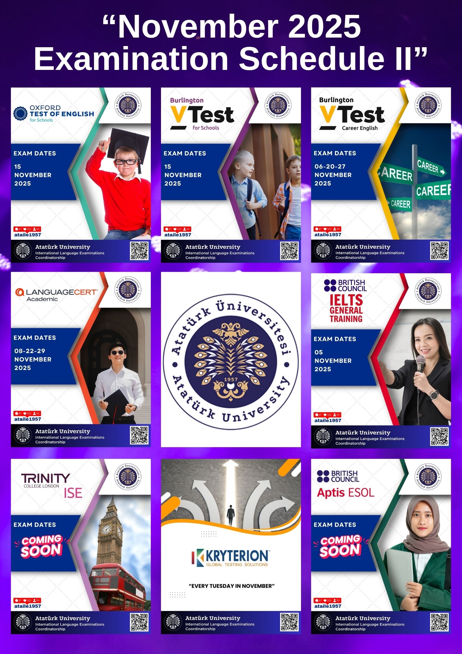 Atatürk Üniversitesi Uluslararası Dil Sınavları Koordinatörlüğü tarafından gerçekleştirilen sınavların Kasım 2025 Sınav takvimi aşağıda bulunmaktadır.